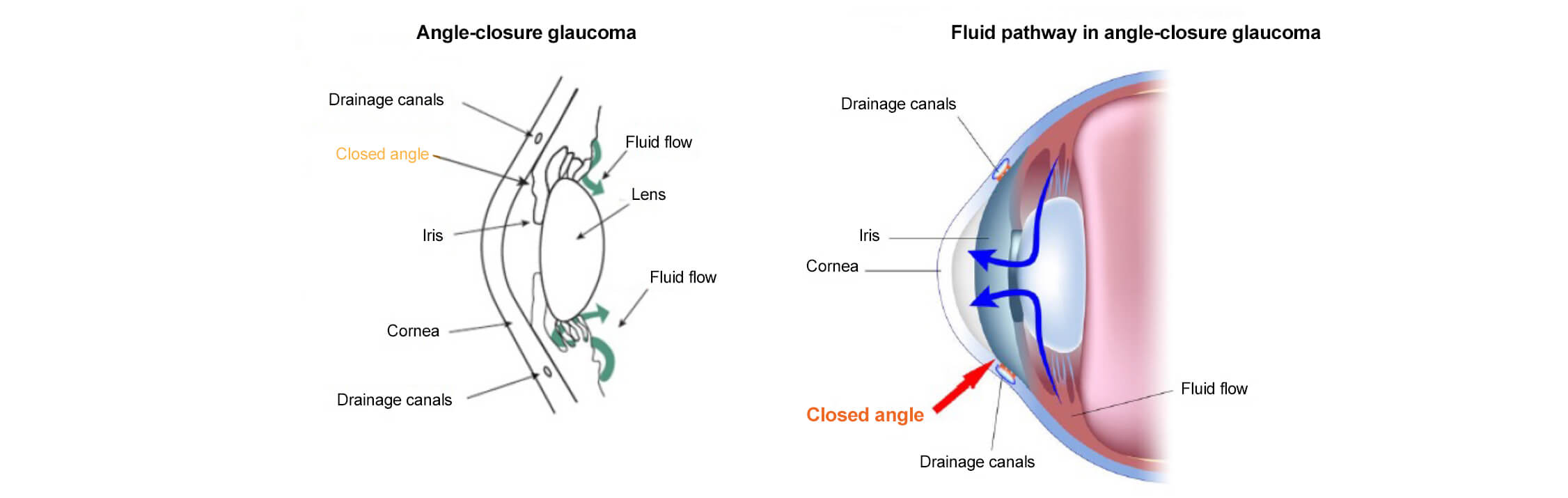 Angle-closure glaucoma occurs when the drainage angle between your iris and cornea becomes too narrow or ‘closed’.1,2 This blocks the drainage canals and causes a sudden rise in pressure in the eye.1,2